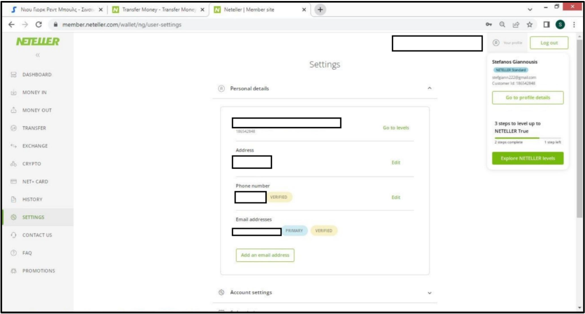 1. Θα χρειαστεί να στείλεις ένα screenshot από την ενότητα “Ρυθμίσεις” του λογαριασμού Neteller όπου είναι εμφανή τα προσωπικά σου στοιχεία: ονοματεπώνυμο, ημ.γέννησης, e-mail, αριθμός πελάτη, διεύθυνση, αριθμός κινητού τηλεφώνου