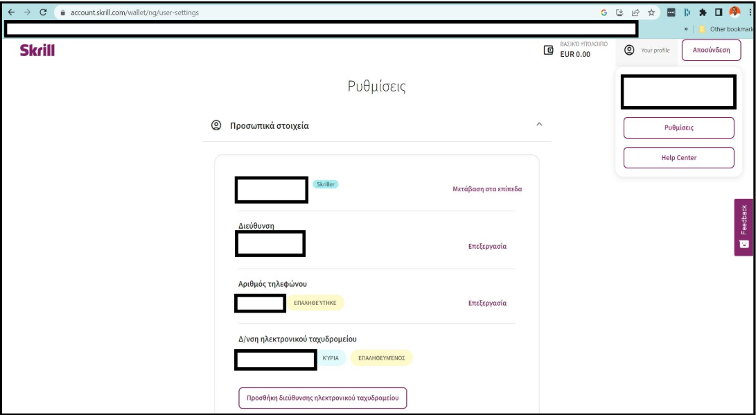 • Από Skrill Application: Επιλέγουμε πάνω αριστερά στο logo του λογαριασμού > Προσωπικά Στοιχεία και κάνουμε το screenshot
