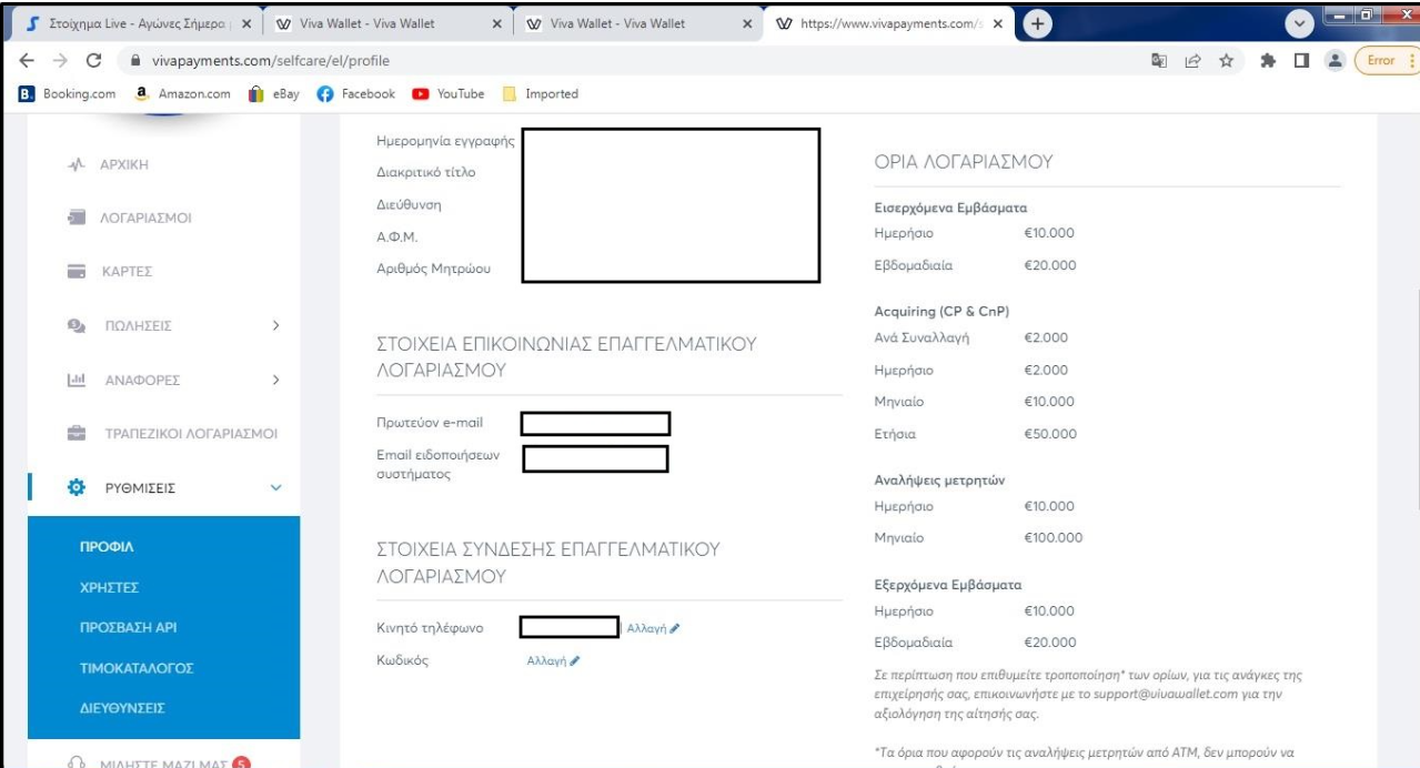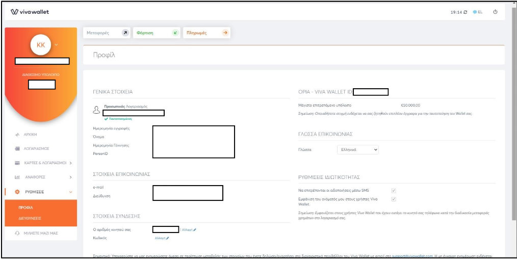 1. Από το μενού Ρυθμίσεις > Προφίλ: Θα χρειαστεί να είναι εμφανή όλα τα στοιχεία: ονοματεπώνυμο, email, viva wallet αριθμός κινητού τηλεφώνου